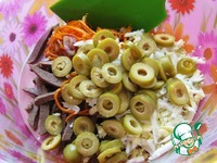 Ко всем ингредиентам добавляем майонез, смесь перцев и соль (соль аккуратно, майонез и оливки солёные). Всё хорошо перемешиваем. |