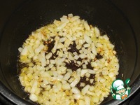 Лук нарезать кубиком и обжаритьв чаше м/с на сливочном масле до золотистого цвета на режиме Жарка (или др.) Добавить очищенный и пропущенный через чеснокодавку чеснок, перемешать |
