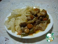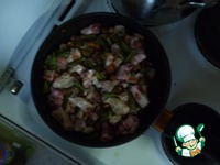 Свинину нарезать кубиками и закинуть в сковороду с овощами. посолить, поперчить |
