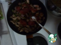 Довести мясо до золотистой корочки, добавить воды и томатную пасту. помешивать |