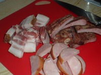 В кастрюлю наливаем 2,5 л воды, доводим до кипения. Пока вода закипает ребрышки, ветчину и бекон режем большими кусочками. Выкладываем в закипевшую воду и варим в течении 1 часа на слабом огне. |