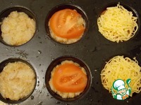 Форму смазать маслом и положить в форму на 2/3. С верху кладем кружочек помидора и присыпаем тертым сыром. |