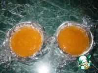 Застывшее желе достать, освбодить от плёнки и сверху положить крышечку от хурмы |