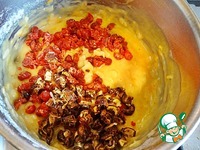 Засахаренную вишню разрежьте пополам, финики освободите от косточек и тоже измельчите, миндальные хлопья и муку добавьте в масляно-сахарный раствор и тщательно перемешайте. |