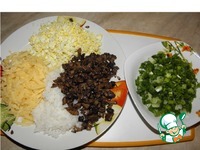 Начинка: грибы порезать и обжарить на масле, яйца и рис отварить, яйца мелко нарезать, сыр натереть на крупной терке, зеленый лук мелко порезать. |