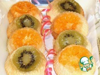 Порежьте мандарины, киви. лимоны, грейпфруты или апельсины в шкурке на кружочки, а потом аккуратно очищайте. Положите на дно формочки по 1 кружочку фруктов. |