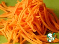 Морковь натрите на терке. Я использовала терку для корейской моркови. Обжарьте морковь до мягкости. |