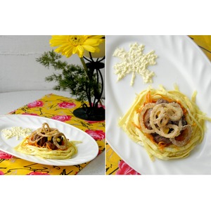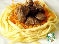 На тарелку выложите «гнездышко» из яичной соломки. Сверху – морковь. |