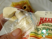 В пакетик выдавите немного майонеза, срежьте уголок и «нарисуйте» рядом с салатом, например, кленовый лист. Или просто покройте салат сеточкой из майонеза. |