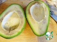 Авокадо разрежем пополам вдоль и удалим косточку. осторожно. чтобы не повредить кожицу, вытащим мякоть. |