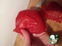Вынуть из духовки болгарский перец, обернуть влажным полотенцем. Удалить плодоножку, внутренние перегородки и семечки, снять кожицу. |