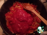 Если используете свежие помидоры, то ошпарьте их и снимите кожицу. Крупно порубите помидоры и добавьте их к овощам в сковороду. Перемешать. |