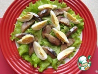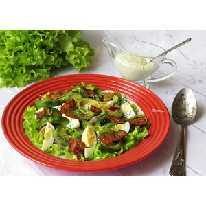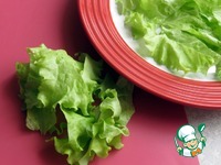 Листья салата рвём или крупно режем и укладываем на блюдо. |