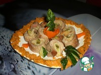 Запечь в духовке до готовности при температуре 180 градусов, разрезать на половинки и сервировать. Я украшала тарелку кабачковой икрой, а рулетики положила под огуречную елочку |