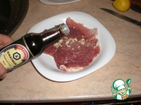 Свинину нарезать, отбить, замариновать в соевом соусе Kikkoman и лимонном соке |