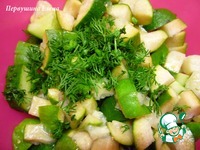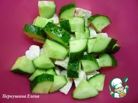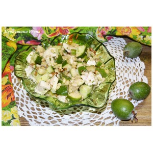 Фейхоа ошпарить кипятком и нарезать на более мелкие кусочки, нежели курицу или огурец. |