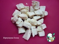 Отварить грудку в подсоленной воде (бульон потом можно использовать для супа). Порезать ее кубиками и положить в миску. |
