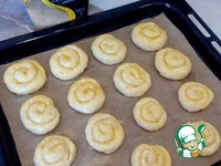 Из теста сформировать булочки (я скатывала жгутик и закручивала в улитку, прижимая плотно хвостик). |