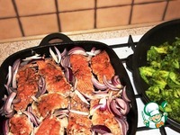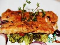 На брокколи выложить готовую рыбку с жареным луком. Полить оставшимся соевым соусом глазурь. Украсить блюдо на свое усмотрение. |