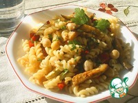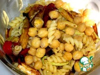 Промыть их холодной водой и добавить к овощам. Добавить нут, перемешать все. |