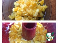 Апельсины очистить от кожуры, нарезать маленькими кубиками, убрать семечки. Порезанный апельсин выложить сверху на тесто. |