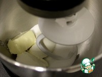 В другой посуде смешиваем сахар, творожный сыр и масло и хорошо перемешиваем миксером на высокой скорости. |