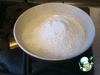Просеиваем муку на сковороду (не смазанную маслом)и жарим ее на среднем огне до золотистого цвета, помешивая (постоянно-переодиче ски) |
