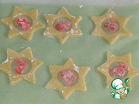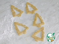 4. Подмороженное тесто раскатать толщиной около 3 мм (стол нужно хорошенько присыпать мукой). Вырезать формочкой печенье желаемой формы. В середине каждого печенья вырезать отверстие (см. фото). |