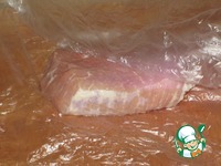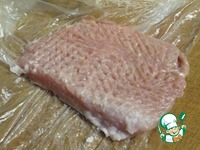 Мякоть нарезать на порционные куски для отбивных. Заворачиваем кусок в пакет или пленку. Это чтобы не запачкать наши милые кухоньки, и отбиваем, но без фанатизма )) |