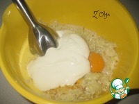 Репчатый лук очистить и тоже измельчить блендером в пюре. К капустной пенной смеси добавляем луковое пюре и панировочные сухари. Все еще раз взбиваем блендером. |