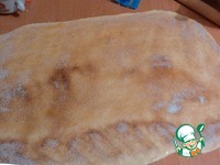 Вам может понадобиться присыпать стол мукой, чтобы тесто не прилипало. Раскатываем тесто в большой прямоугольник толщиной примерно 0,5 см. |