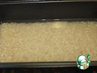 Выкладываем его в форму для запекания и заливаем водой. Вода должна покрывать рис и быть выше его уровня примерно на 5 мм. |