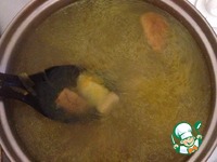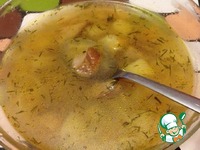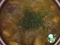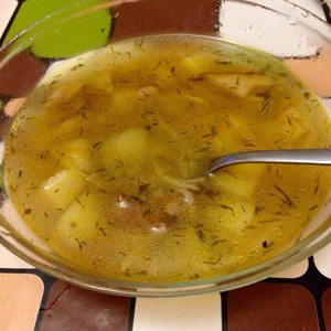 Всыпаем горсть лапши, перемешиваем. Солим, перчим по вкусу. Добавляем сушеный укроп. Закрываем крышкой и даем настояться супу 10 минут |