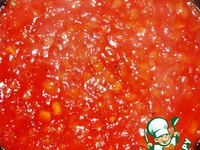 Добавить томатную пасту, соль по вкусу и чайную ложку сахара. Перемешать, добавить немного воды, потушить 3-4 минуты. |