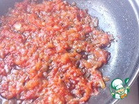 Помидоры ошпарить кипятком, снять кожицу, мякоть мелко нарезать. Лук мелко порубить и обжарить на небольшом количестве растительного масла, добавить помидоры и тушить 15 минут. |