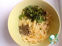 Сыр натереть на крупной или средней терке и смешать с мелконарезанным базиликом (я использовала сухой базилик). Добавить петрушку или укроп. |
