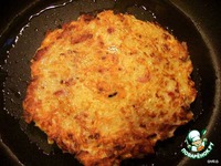 На разогретую с маслом сковороду выкладываем половину картофельного теста и разравниваем, чтобы получилась большая круглая лепёшка. То же самое проделываем с оставшимся тестом на другой сковороде. |