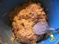 Отжатый картофель перекладываем в глубокую посуду, добавляем лук с беконом, муку, слегка взбитое (с помощью вилки) яйцо, соль и перец. Тщательно перемешиваем и оставляем. |