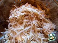 Пока готовится зажарка, очищенный картофель потрём на крупной тёрке. Кладём тёртый картофель в друшлаг. |