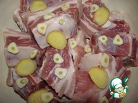 Ребра разрезать на небольшие части. Нарезать имбирь и чеснок. Выложить ребра, чеснок и имбирь в кастрюлю, посолить, залить водой и поставить варить в районе часа. |