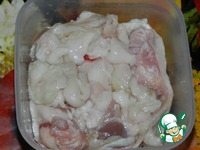 Мясо промываем холодной водой, режем на средние кусочки. Затем складываем в ёмкость, заливаем 500 мл воды и 1 ст. л. уксуса. В этом растворе мясо должно мариноваться в холодильнике в течение часа. |