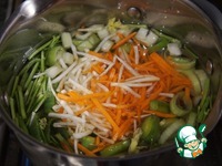 Сварить овощной бульон, процедить. Бульона может понадобиться немного больше одного литра, это зависит от размера овощей. |