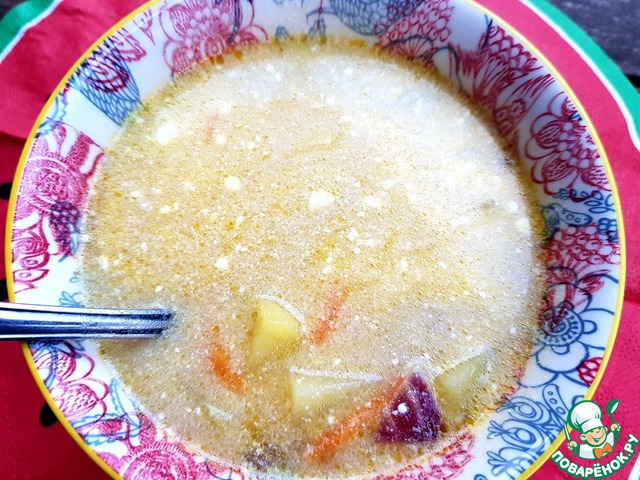 Можно при желании предварительно положить в тарелки с супом гренки из белого хлеба.