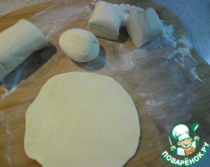 Разрезать на кусочки, слегка скатать в шарик. Каждый шарик раскатать.