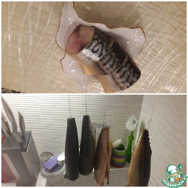 На третьи сутки достаем рыбу. После этого, я привязал за рыбу за хвост и подвесил на ночь над раковиной на кухне, подстелив газету. Висячую рыбу кисточкой смазал растительным маслом.