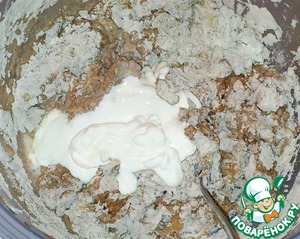 300 г муки, семена подсолнечника и корицу насыпать в миску. Налить сливки. ( Семечки я немного поджарила в микроволновке в тарелке под тарелкой ).