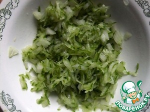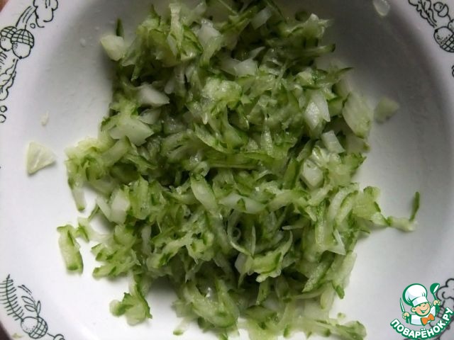 • Огурцы натереть на крупной терке. Лук почистить и мелко нашинковать.