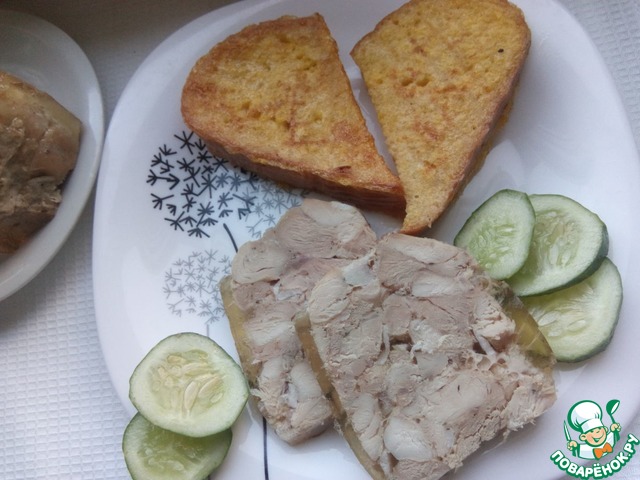 Делала из куриного филе и на половину порции,мне немного суховато показалось, но в целом сильно это не испортило и показалось так только мне). Делала не в коробке,а просто в пищевой пленке,фольге и сверху пленке, т.к. очень хотелось попробовать,а коробки из под сока или подобного что-то не оказалось) Видимо из-за этого весь желатин был по поверхности,а внутри его не оказалось.