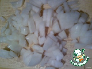 Лук очищаем, режем на кусочки и обжариваем на том же масле, на котором жарили печень.