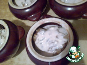 Заливаем сметанной смесью печень, закрываем горшочек крышкой и в духовку на 1 час на средний огонь.